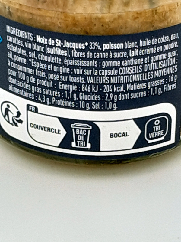 Ingrédients : NOIX DE SAINT-JACQUES 33%, POISSON blanc, huile de colza, eau, carottes, vin blanc (SULFITES), fibres de canne à sucre, LAIT écrémé en poudre, échalotes, sel, ciboulette, épaississants : gomme xanthane et gomme guar, ail, poivre.